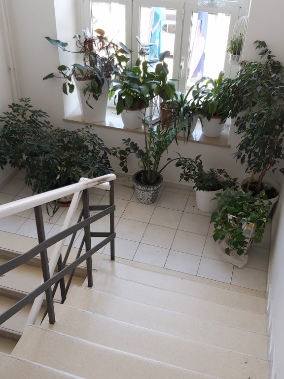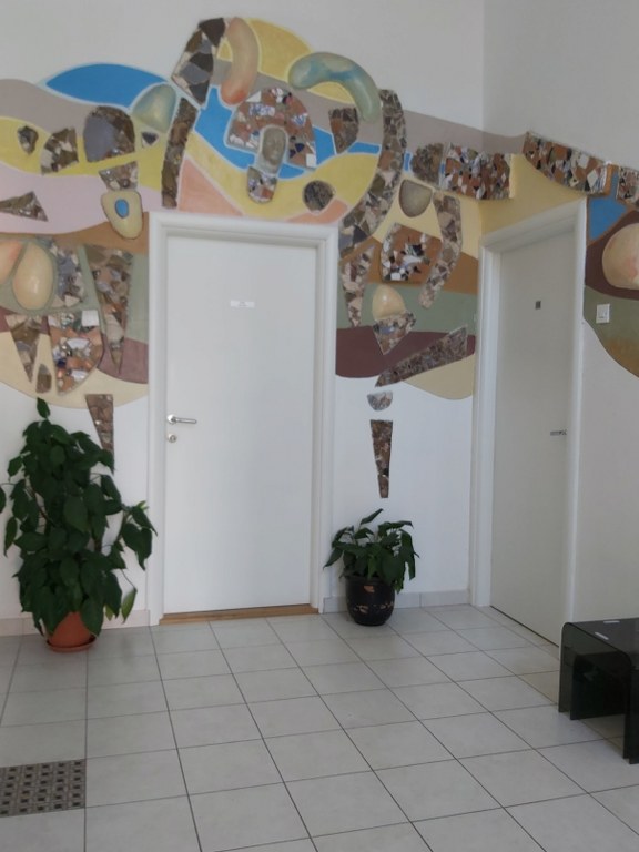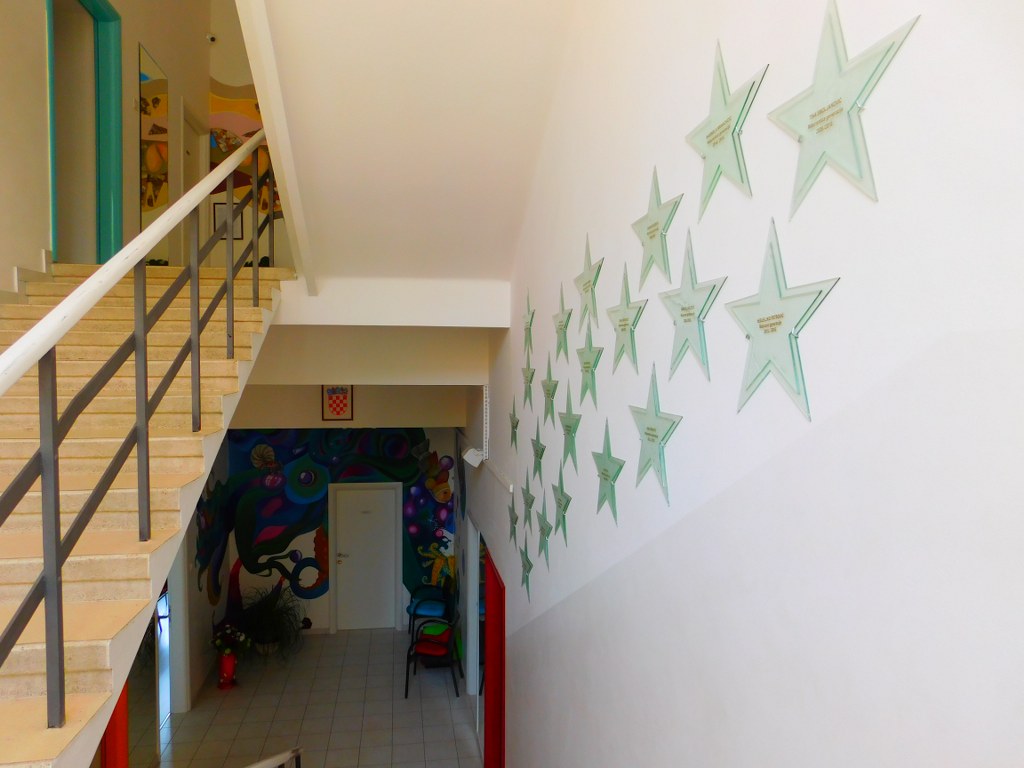 Vrlo je prozračan, uređen razigranim koloritima zidnih murala. Oslikane su velike zidne površine, mozaici na zidu, zanimljive dekoracije u blagovaoni i sl. Na trećem katu je velika terasa s predivnim pogledom na Kvarner. Imamo uređenu vanjsku teretanu i sjenicu.